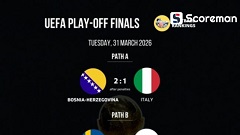 이탈리아는 3회 연속 월드컵 좌절...유럽 PO 승자 최종 확정FIFA 월드컵 유럽 지역 예선 보스니아 헤르체고비나 이탈리아 보스니아 헤르체고비나 VS 이탈리아 -